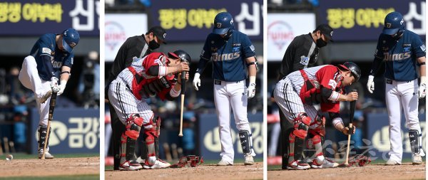 10일 서울 잠실야구장에서 ‘2022 신한은행 MY CAR KBO리그’ NC 다이노스와 LG 트윈스 경기가 열렸다. 5회초 무사 NC 박건우 배트의 링이 안빠지자 LG 유강남이 빼주고 있다.