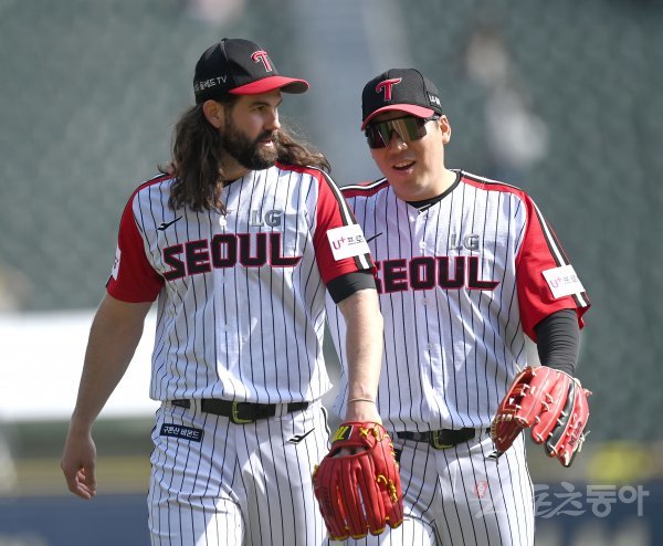 10일 서울 잠실야구장에서 ‘2022 신한은행 MY CAR KBO리그’ NC 다이노스와 LG 트윈스 경기가 열렸다. 4회초 수비를 마치고 LG 켈리와 김현수가 이야기하며 더그아웃으로 향하고 있다.