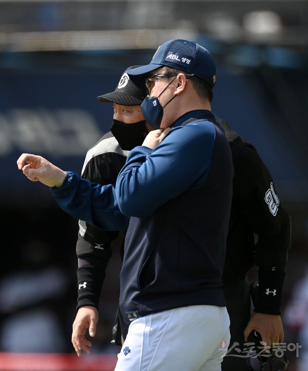 10일 서울 잠실야구장에서 ‘2022 신한은행 MY CAR KBO리그’ NC 다이노스와 LG 트윈스 경기가 열렸다. 2회초 NC 이동욱 감독이 이계성 주심에게 무언가를 어필하고 있다.
