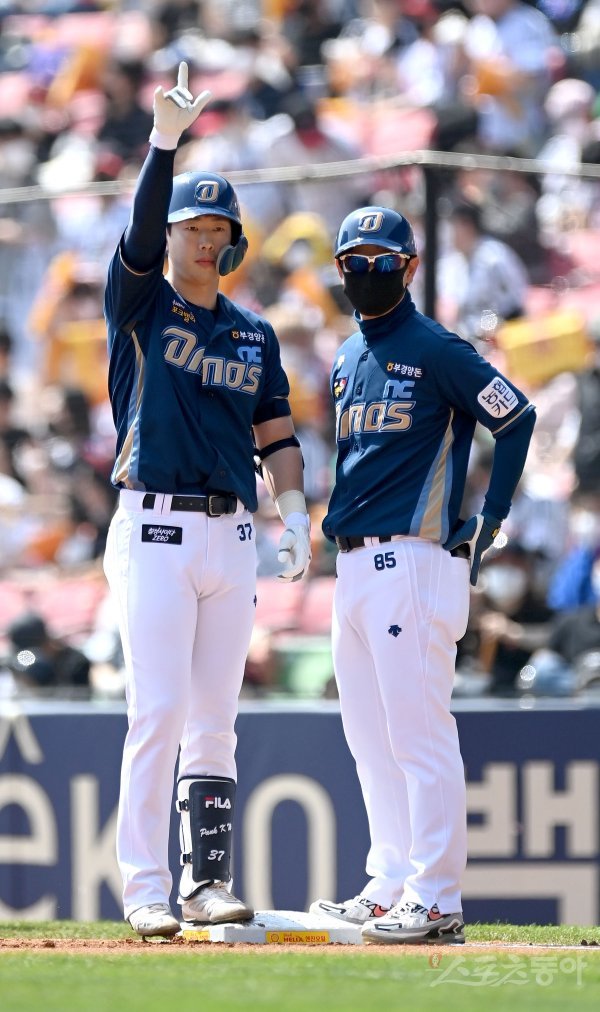 10일 서울 잠실야구장에서 ‘2022 신한은행 MY CAR KBO리그’ NC 다이노스와 LG 트윈스 경기가 열렸다. 1회초 1사 1루 NC 박건우가 우전 안타를 치고 1루에서 기뻐하고 있다.