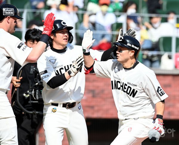 10일 인천 SSG 랜더스필드에서 ‘2022 신한은행 SOL KBO리그’ SSG 랜더스와 KIA 타이거즈의 경기가 열렸다. 4회말 1사 2, 3루에서 SSG 최주환이 3점 홈런을 쏘아 올린 뒤 동료들의 환영을 받고 있다.
