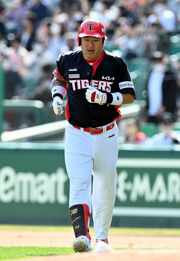 10일 인천 SSG 랜더스필드에서 ‘2022 신한은행 SOL KBO리그’ SSG 랜더스와 KIA 타이거즈의 경기가 열렸다. 6회초 무사 1, 2루에서 KIA 최형우가 병살타를 날린 후 아쉬워하고 있다.