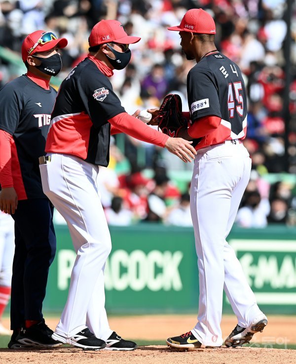 10일 인천 SSG 랜더스필드에서 ‘2022 신한은행 SOL KBO리그’ SSG 랜더스와 KIA 타이거즈의 경기가 열렸다. 4회말 무사 만루에서 KIA 선발 로니가 교체되고 있다.