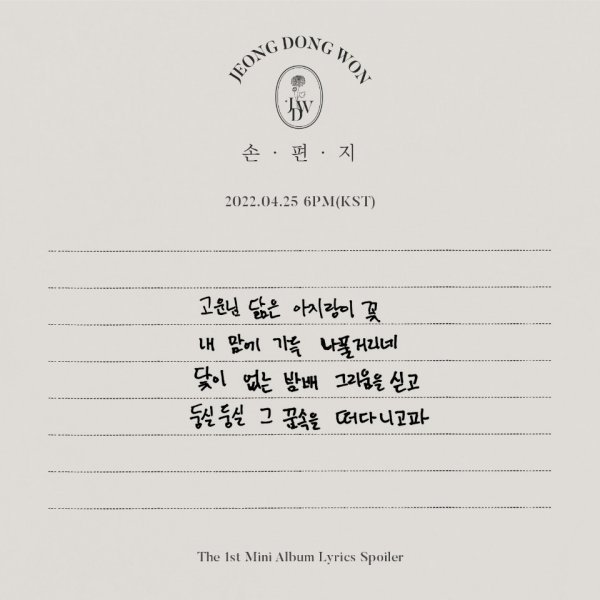 해당 이미지에는 정동원이 자필로 담은 새 미니앨범 ‘손편지’의 가사 일부가 공개됐다. 정동원은 편지지로 된 이미지 위에 '고운님 닮은 아지랑이 꽃 / 내 맘에 가득 나풀거리네 / 닻이 없는 밤배 그리움을 싣고 / 둥실둥실 그 꿈속을 떠다니고파'라는 가사를 담았다. 한 편의 시를 떠오르게 하는 감성적인 가사가 인상적이다.