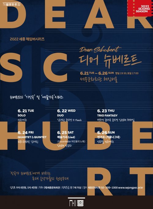 세종문화회관은 6월 21일부터 26일까지 세종체임버홀에서 2022 ‘세종 체임버 시리즈’ <디어 슈베르트(Dear Schubert)>를 개최한다.