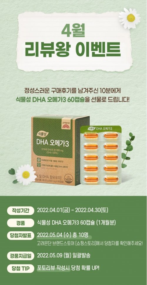 공식몰에서 제품을 구매한 뒤, 제품리뷰를 작성하면 된다. 포토리뷰를 작성할 경우 당첨 확률이 높아진다. 리뷰를 작성한 사람 중 10명에게 ‘식물성 DHA 오메가3’을 선물로 증정한다. 당첨자는 5월4일 공식몰의 쇼핑스토리‘ 탭에서 확인가능하다.