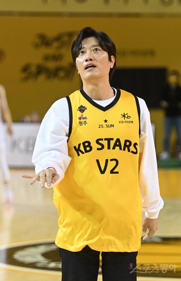 12일 충북 청주체육관에서 열린 ‘삼성생명 2021-2022 여자프로농구’ 청주 KB와 아산 우리은행의 챔피언결정전 2차전 경기에서 배우 박희순이 시투를 하고 있다.