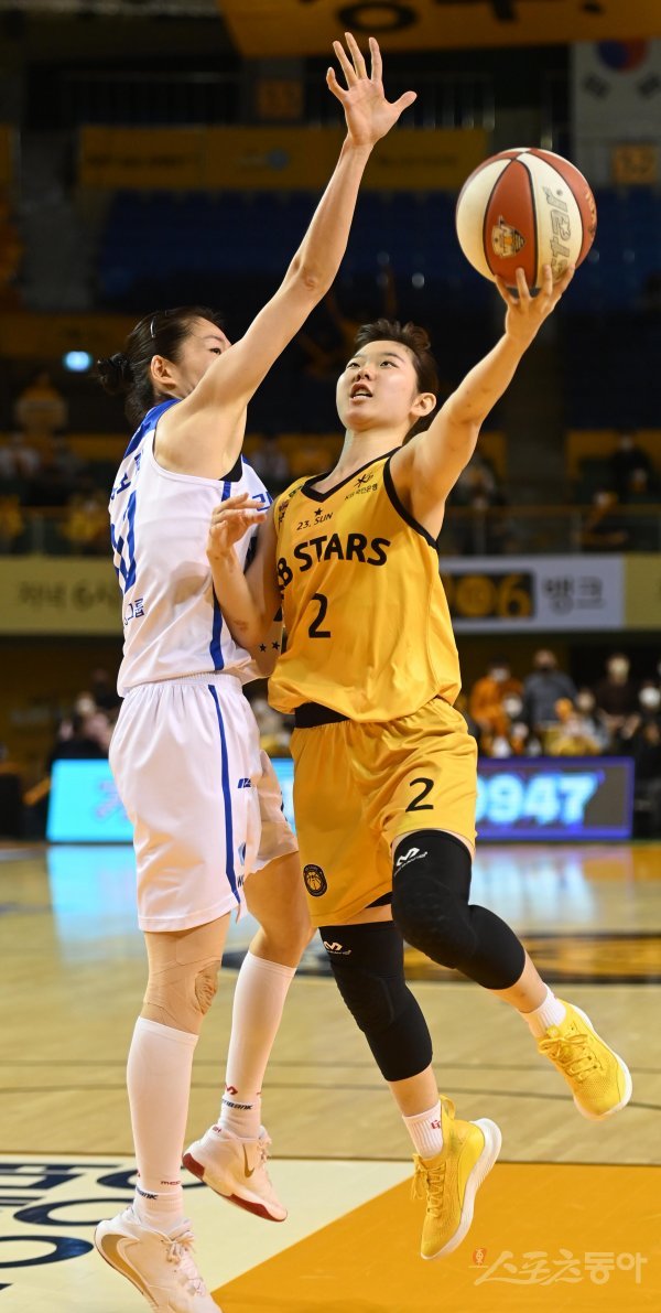 12일 충북 청주체육관에서 열린 ‘삼성생명 2021-2022 여자프로농구’ 청주 KB와 아산 우리은행의 챔피언결정전 2차전 경기에서 KB 허예은이 우리은행 수비 앞에서 슛을 하고 있다.