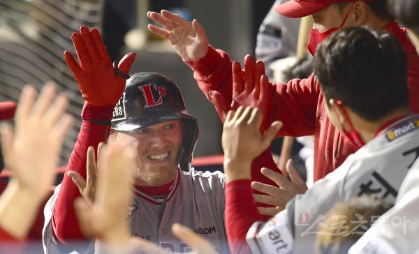 12일 서울 잠실야구장에서 ‘2022 신한은행 MY CAR KBO리그’ SSG 랜더스와 LG 트윈스 경기가 열렸다. 4회초 2사 1루 SSG 크론이 좌월 투런 홈런을 날리고 그라운드를 돌아 홈인해 하이파이브 하고 있다.