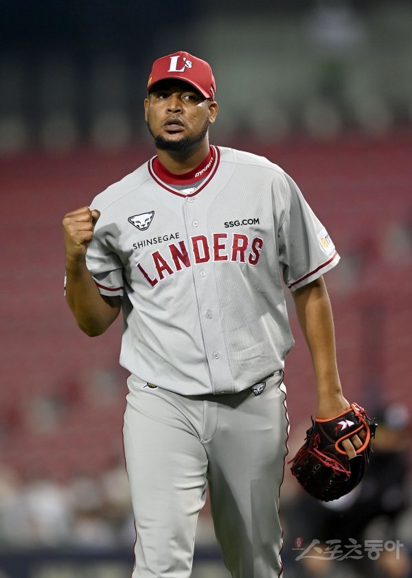 12일 서울 잠실야구장에서 ‘2022 신한은행 MY CAR KBO리그’ SSG 랜더스와 LG 트윈스 경기가 열렸다. 선발 투수로 등판한 SSG 노바가 4회말 2사 2루 상황에서 LG 타자를 내야 땅볼로 아웃시킨 후 기뻐하고 있다.