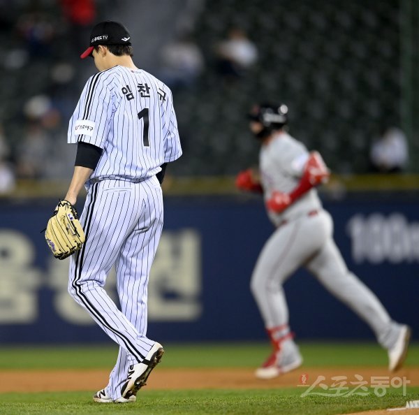12일 서울 잠실야구장에서 ‘2022 신한은행 MY CAR KBO리그’ SSG 랜더스와 LG 트윈스 경기가 열렸다. LG 선발 임찬규가 4회초 2사 1루 SSG 크론에게 좌월 투런 홈런을 허용하고 있다.