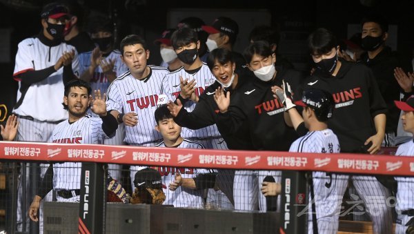 12일 서울 잠실야구장에서 ‘2022 신한은행 MY CAR KBO리그’ SSG 랜더스와 LG 트윈스 경기가 열렸다. 1회말 1사 3루 LG 내야 땅볼 때 득점에 성공한 LG 홍창기가 더그아웃에서 하이파이브 하고 있다.