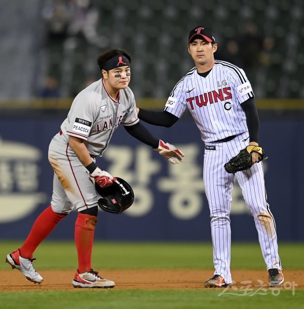 12일 서울 잠실야구장에서 ‘2022 신한은행 MY CAR KBO리그’ SSG 랜더스와 LG 트윈스 경기가 열렸다. 6회초 1사 1루 SSG 삼진 아웃 때 1루주자 추신수가 2루 도루를 시도했으나 아웃된 후 오지환과 부상에 대한 걱정을 해주고 있다.