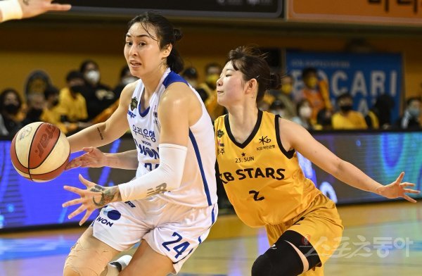 12일 충북 청주체육관에서 열린 ‘삼성생명 2021-2022 여자프로농구’ 청주 KB와 아산 우리은행의 챔피언결정전 2차전 경기에서 KB 허예은이 우리은행 김소니아의 볼을 스틸하고 있다.