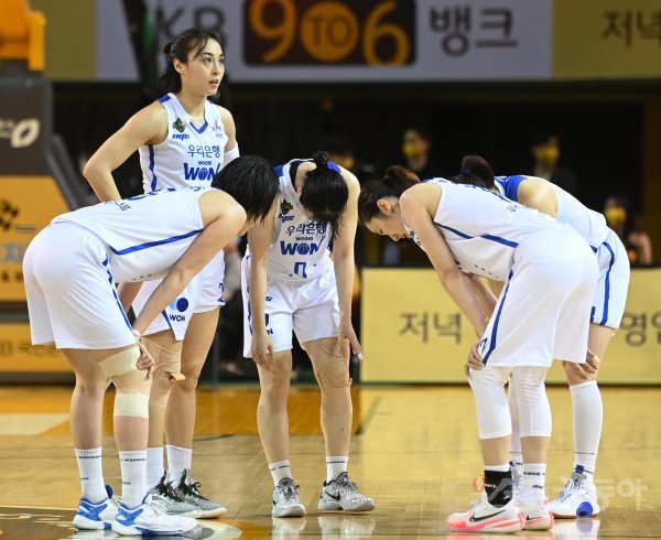 12일 충북 청주체육관에서 열린 ‘삼성생명 2021-2022 여자프로농구’ 청주 KB와 아산 우리은행의 챔피언결정전 2차전 경기에서 우리은행 선수들이 비디오판독을 기다리며 이야기를 하고 있다.