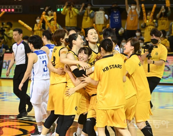 12일 충북 청주체육관에서 열린 ‘삼성생명 2021-2022 여자프로농구’ 청주 KB와 아산 우리은행의 챔피언결정전 2차전 경기에서 우리은행에 80-73으로 승리를 거둔 KB 선수들이 기쁨을 나누고 있다.