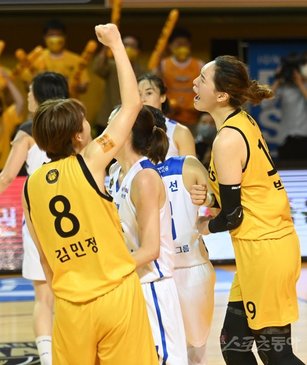 12일 충북 청주체육관에서 열린 ‘삼성생명 2021-2022 여자프로농구’ 청주 KB와 아산 우리은행의 챔피언결정전 2차전 경기에서 KB 박지수가 득점에 성공한 후 포효하고 있다.