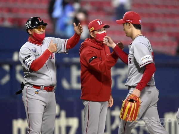 12일 서울 잠실야구장에서 열린 ‘2022 신한은행 MY CAR KBO리그’ SSG 랜더스와 LG 트윈스 경기에서 SSG가 4-1 승리를 거두며 개막 9연승을 달렸다. 김원형 감독과 김민재 코치가 선수들과 하이파이브 하고 있다.