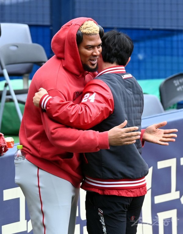 13일 서울 잠실야구장에서 ‘2022 신한은행 SOL KBO리그’ LG 트윈스와 SSG 랜더스의 경기가 열린다. 경기 전 SSG 노바가 김상수와 포옹을 나누고 있다.