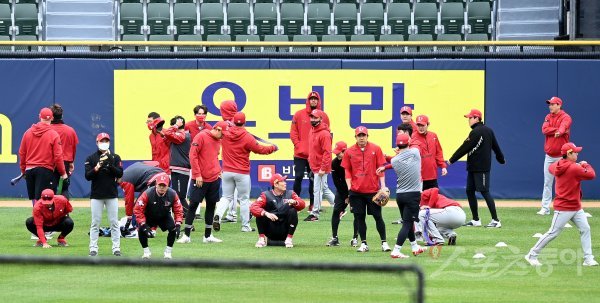 13일 서울 잠실야구장에서 ‘2022 신한은행 SOL KBO리그’ LG 트윈스와 SSG 랜더스의 경기가 열린다. 경기 전 SSG 선수들이 외야에서 훈련을 하고 있다.