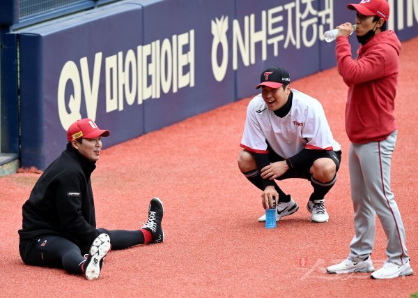 13일 서울 잠실야구장에서 ‘2022 신한은행 SOL KBO리그’ LG 트윈스와 SSG 랜더스의 경기가 열린다. 경기 전 LG 유강남이 SSG 한유섬과 이야기를 나누고 있다.