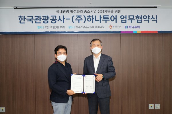 하나투어(대표이사 송미선, 육경건)는 한국관광공사와 국내관광 활성화 및 중소기업 상생지원을 위한 업무협약을 체결했다.양사는 국내관광상품 및 콘텐츠 공동개발, 소규모 관광사업자와의 협업을 통한 공동성장 등을 추진하는데 협력한다. 하나투어는 한국관광공사와 진행 중인 국내관광업 활성화 프로젝트 ‘월간19투어’를 확대하고 웰니스 사업을 연계한 국내관광상품 개발 등 지역관광 발전에 앞장선다. 한국관광공사는 하나투어의 관광상품 개발 관련 콘텐츠 제공 및 홍보 마케팅을 지원하고 관광벤처, 지역관광기업 등과의 협업 관계 구축에 힘쓴다.
