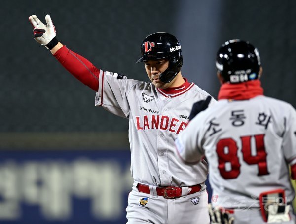 13일 서울 잠실야구장에서 ‘2022 신한은행 SOL KBO리그’ LG 트윈스와 SSG 랜더스의 경기가 열렸다. 4회초 1사 1, 3루에서 SSG 이재원이 1타점 적시타를 날린 후 세리머니를 펼치고 있다.