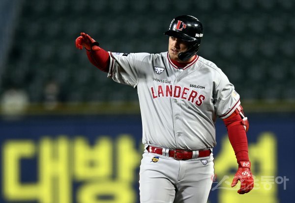 13일 서울 잠실야구장에서 ‘2022 신한은행 SOL KBO리그’ LG 트윈스와 SSG 랜더스의 경기가 열렸다. 5회초 2사 1루에서 SSG 크론이 안타를 날린 후 세리머니를 펼치고 있다.