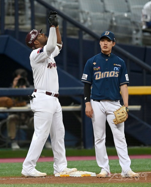 13일 서울 고척스카이돔에서 ‘2022 신한은행 MY CAR KBO리그’ NC 다이노스와 키움 히어로즈 경기가 열렸다. 5회말 1사 키움 푸이그가 중전 안타를 치고 NC 실책하는 사이 3루까지 달려 세이프 된 후 기뻐하고 있다.