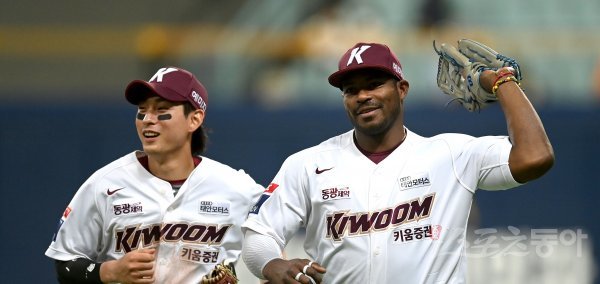 13일 서울 고척스카이돔에서 ‘2022 신한은행 MY CAR KBO리그’ NC 다이노스와 키움 히어로즈 경기가 열렸다. 3회말 2사 만루 키움 푸이그가 다이빙 캐치로 실점을 막은 후 이정후와 웃으며 더그아웃으로 향하고 있다.