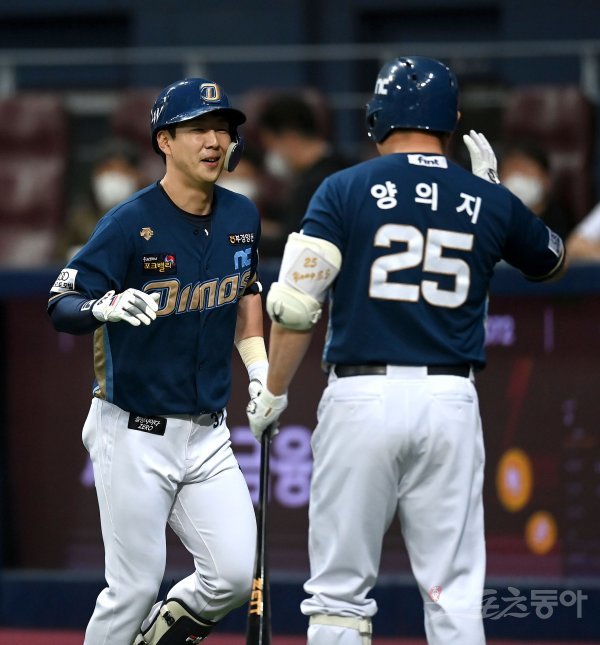 13일 서울 고척스카이돔에서 ‘2022 신한은행 MY CAR KBO리그’ NC 다이노스와 키움 히어로즈 경기가 열렸다. 1회초 무사 1,2루 NC 박건우가 좌월 스리런 홈런을 날리고 홈인해 하이파이브 하고 있다.