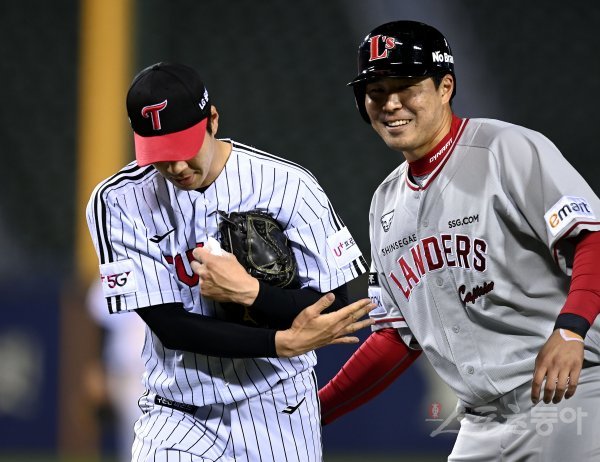 13일 서울 잠실야구장에서 ‘2022 신한은행 SOL KBO리그’ LG 트윈스와 SSG 랜더스의 경기가 열렸다. 9회초 1사에서 SSG 한유섬이 몸에 맞는 볼로 출루하며 LG 김대유와 이야기를 나누고 있다.