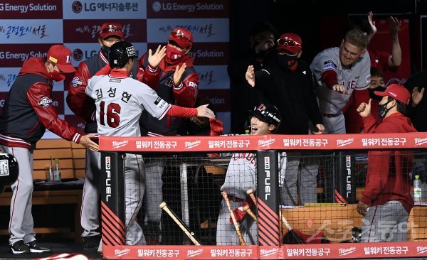 13일 서울 잠실야구장에서 ‘2022 신한은행 SOL KBO리그’ LG 트윈스와 SSG 랜더스의 경기가 열렸다. 9회초 2사 3루에서 SSG 김성현이 적시타 때 득점을 올린 후 코치들과 기쁨을 나누고 있다.