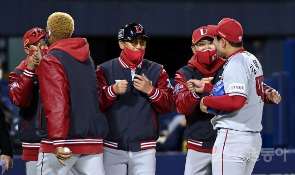 13일 서울 잠실야구장에서 ‘2022 신한은행 SOL KBO리그’ LG 트윈스와 SSG 랜더스의 경기가 열렸다. SSG가 LG를 상대로 4-2로 승리한 뒤 김원형 감독이 김택형을 환영하고 있다. 잠실 | 김민성 기자 marineboy@donga.com