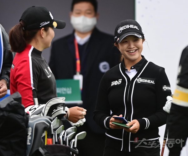14일 경기도 여주 페럼클럽에서 열린 KLPGA ‘메디힐-한국일보 챔피언십’ 1번홀에서 김세영이 티샷에 앞서 동료들과 이야기를 하고 있다.