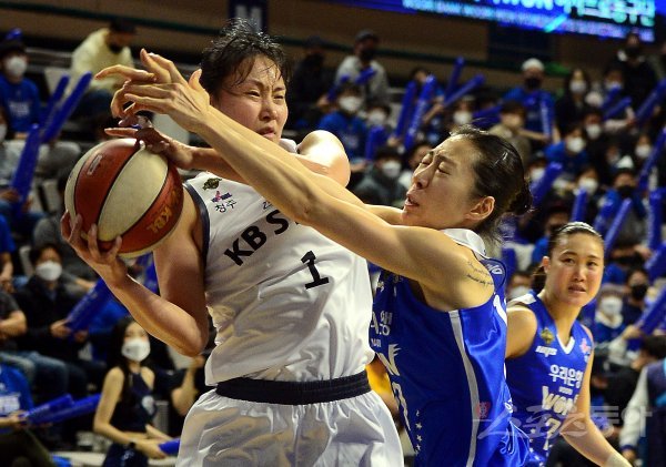 14일 충남 아산이순신체육관에서 열린 ‘삼성생명 2021-2022 여자프로농구’ 아산 우리은행과 청주 KB의 챔프전 경기에서 KB 염윤아와 우리은행 홍보람이 볼 다툼을 벌이고 있다.