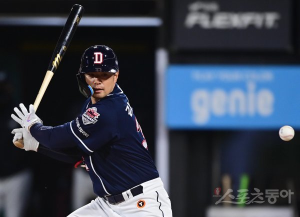 14일 경기도 수원KT위즈파크에서 열린 ‘2022 신한은행 SOL KBO리그’ KT 위즈와 두산 베어스의 경기에서 4회초 1사 두산 김재환이 파울 타구를 쳐다보고 있다.