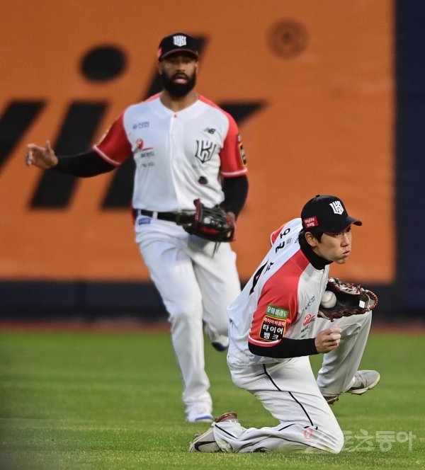 14일 경기도 수원KT위즈파크에서 열린 ‘2022 신한은행 SOL KBO리그’ KT 위즈와 두산 베어스의 경기에서 2회초 1사 1, 2루 두산의 땅볼 때 KT 2루수 오윤석이 볼을 한 번 놓친 뒤 잡고 있다.