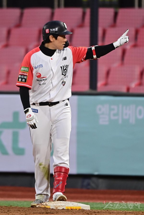 14일 경기도 수원KT위즈파크에서 열린 ‘2022 신한은행 SOL KBO리그’ KT 위즈와 두산 베어스의 경기에서 2회말 1사 2루 KT 오윤석이 선제 1타점 중전 적시타를 쳐낸 뒤 1루 더그아웃을 향해 세리머니를 하고 있다.
