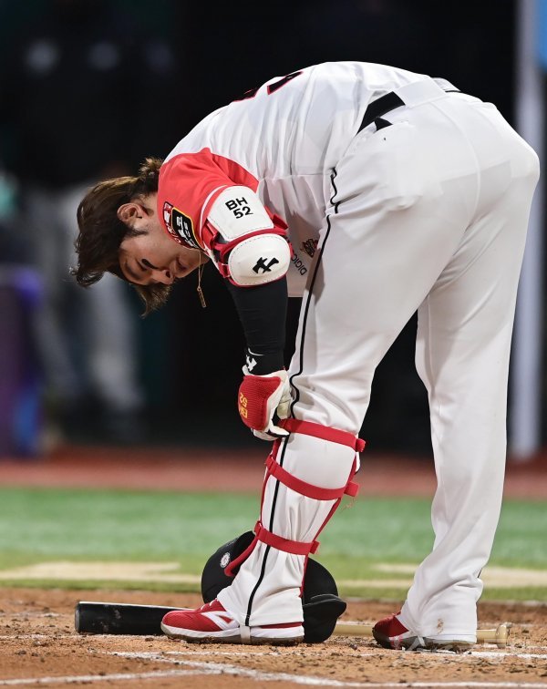 14일 경기도 수원KT위즈파크에서 열린 ‘2022 신한은행 SOL KBO리그’ KT 위즈와 두산 베어스의 경기에서 3회말 2사 KT 박병호가 삼진 아웃을 당한 뒤 보호 장비를 벗고 있다.