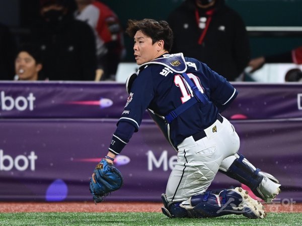 14일 경기도 수원KT위즈파크에서 열린 ‘2022 신한은행 SOL KBO리그’ KT 위즈와 두산 베어스의 경기에서 5회말 1사 2루 KT의 번트 뜬공 타구를 두산 박세혁이 잡은 뒤 2루 주자를 쳐다보고 있다.