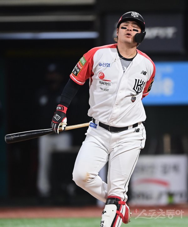 14일 경기도 수원KT위즈파크에서 열린 ‘2022 신한은행 SOL KBO리그’ KT 위즈와 두산 베어스의 경기에서 6회말 2사 KT 박병호가 헛스윙 삼진 아웃을 당하고 있다.