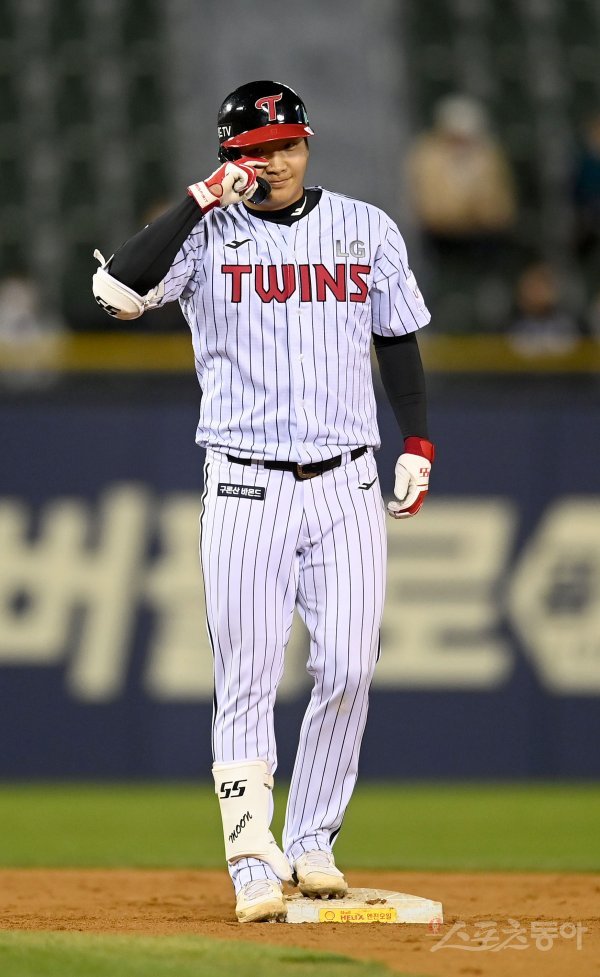 14일 서울 잠실야구장에서 ‘2022 신한은행 MY CAR KBO리그’ SSG 랜더스와 LG 트윈스 경기가 열렸다. 5회말 2사 1,2루 LG 문보경이 2타점 중전 2루타를 2루에서 기뻐하고 있다.