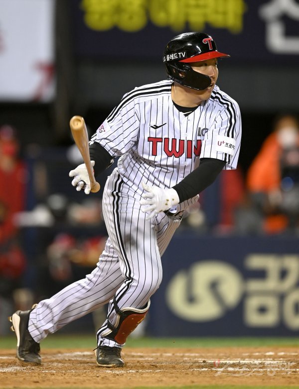 14일 서울 잠실야구장에서 ‘2022 신한은행 MY CAR KBO리그’ SSG 랜더스와 LG 트윈스 경기가 열렸다. 5회말 1사 1루 LG 김현수가 우전 안타를 치고 있다.