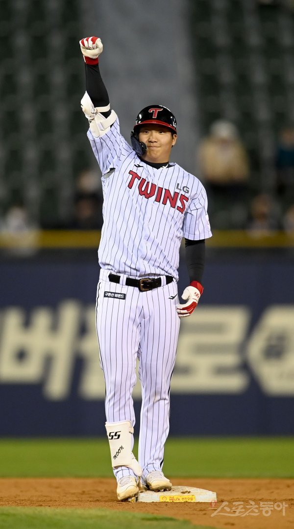 14일 서울 잠실야구장에서 ‘2022 신한은행 MY CAR KBO리그’ SSG 랜더스와 LG 트윈스 경기가 열렸다. 5회말 2사 1,2루 LG 문보경이 2타점 중전 2루타를 2루에서 기뻐하고 있다.