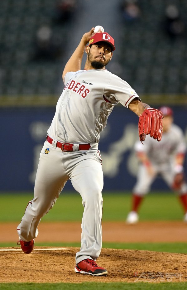 14일 서울 잠실야구장에서 ‘2022 신한은행 MY CAR KBO리그’ SSG 랜더스와 LG 트윈스 경기가 열렸다. 선발 투수로 등판한 SSG 폰트가 역투하고 있다.