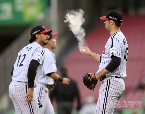 14일 서울 잠실야구장에서 ‘2022 신한은행 MY CAR KBO리그’ SSG 랜더스와 LG 트윈스 경기가 열렸다. 선발 투수로 등판한 LG 플럿코가 1회초 투구를 마치고 루이즈가 던져주는 로진백을 받고 있다.