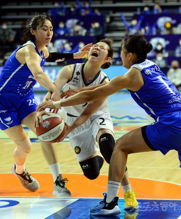14일 충남 아산이순신체육관에서 열린 ‘삼성생명 2021-2022 여자프로농구’ 아산 우리은행과 청주 KB의 챔프전 경기에서 KB 허예은이 우리은행 수비 사이로 돌파하고 있다.