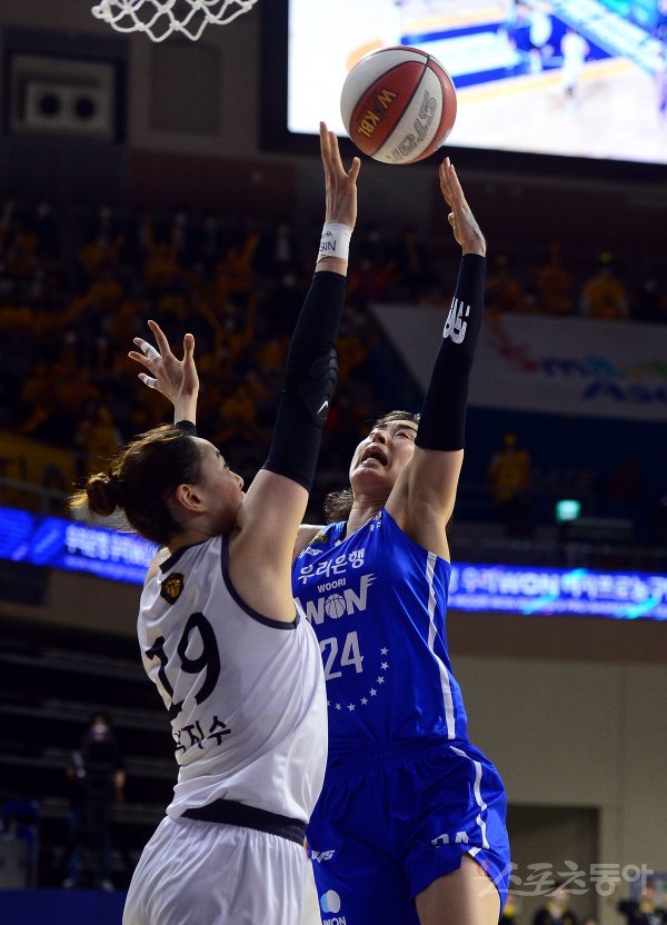 14일 충남 아산이순신체육관에서 열린 ‘삼성생명 2021-2022 여자프로농구’ 아산 우리은행과 청주 KB의 챔프전 경기에서 우리은행 김소니아가 KB 박지수의 수비를 앞에 두고 슛을 쏘고 있다.