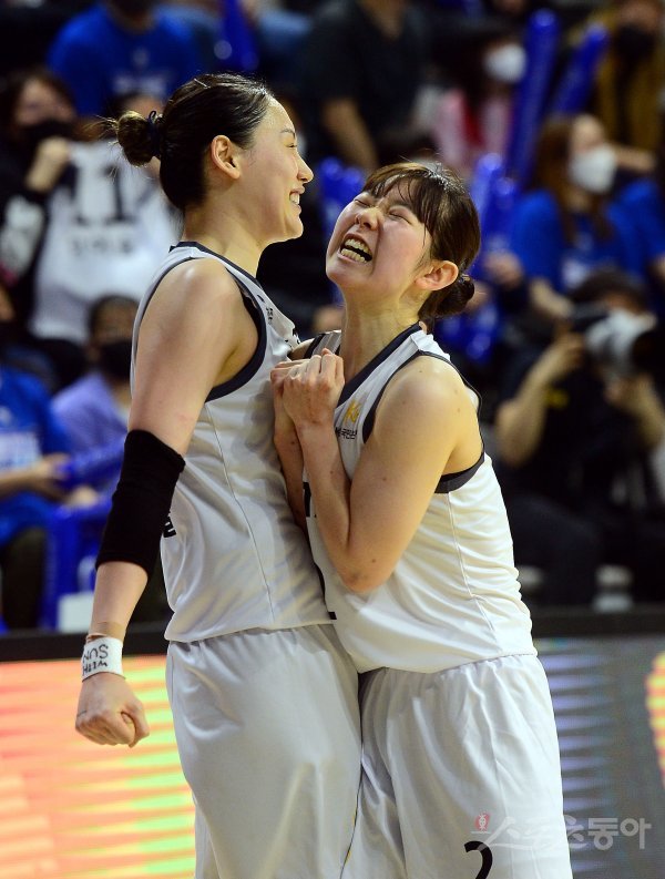 14일 충남 아산이순신체육관에서 열린 ‘삼성생명 2021-2022 여자프로농구’ 아산 우리은행과 청주 KB의 챔프전 경기에서 KB 강이슬이 득점을 올린 후 허예은과 기쁨을 나누고 있다.